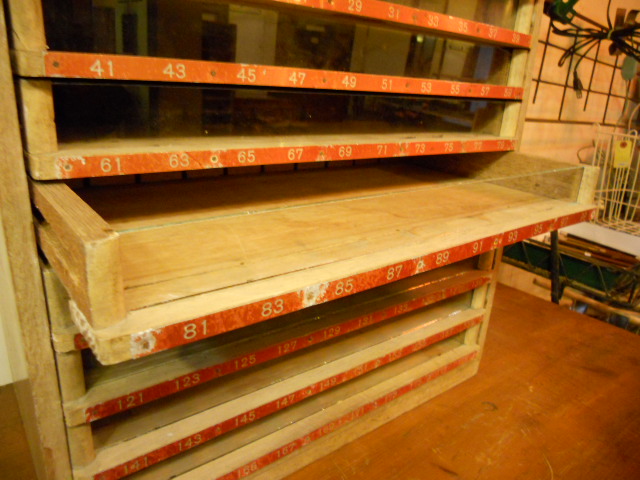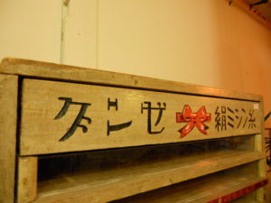 レトロな11段の糸ケース 黒文字と赤いリボンが可愛いです。この部分も引き出しになってます。サイズ H57.5cm×W44.5cm×D25cm