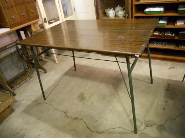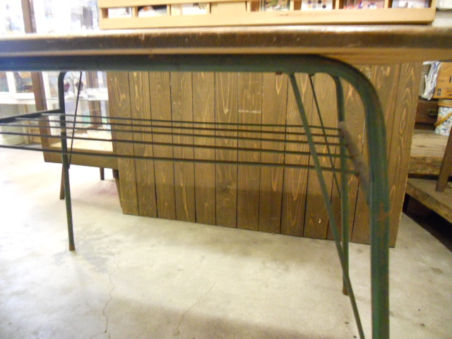 緑色のパイプ脚テーブル。黒や錆び色の脚は多いですが、緑色は珍しいですね。天板の木の色とよく合っています。サイズ H69cm×W101.5cm×D70.5cm